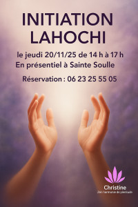 Initiation au Lahochi Le Lahochi est une énergie de guérison puissante et douce, transmise par l’imposition des mains. Elle agit sur tous les plans de l’être — physique, émotionnel, mental et spirituel — favorisant l’harmonisation, lâ€... Lire plus...